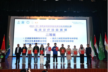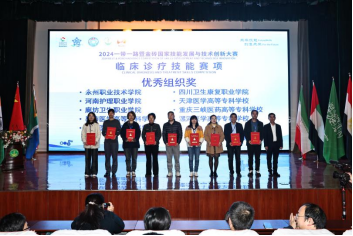 2024年11月17日,2024“一带一路”暨金砖国家技能发展与技术创新大赛临床诊疗技能赛项圆满落幕,来自全国共计45支参赛队、90名参赛选手参赛。漯河医学高等专科学校临床医学院两名参赛选手刘必海、王敏展现出了扎实的专业技能和卓越的团队协作精神,在激烈的竞争中凭借出色表现,斩获银牌(团队二等奖),陈杰、范柳笛获“优秀指导教师”称号,学校获“优秀组织奖”。