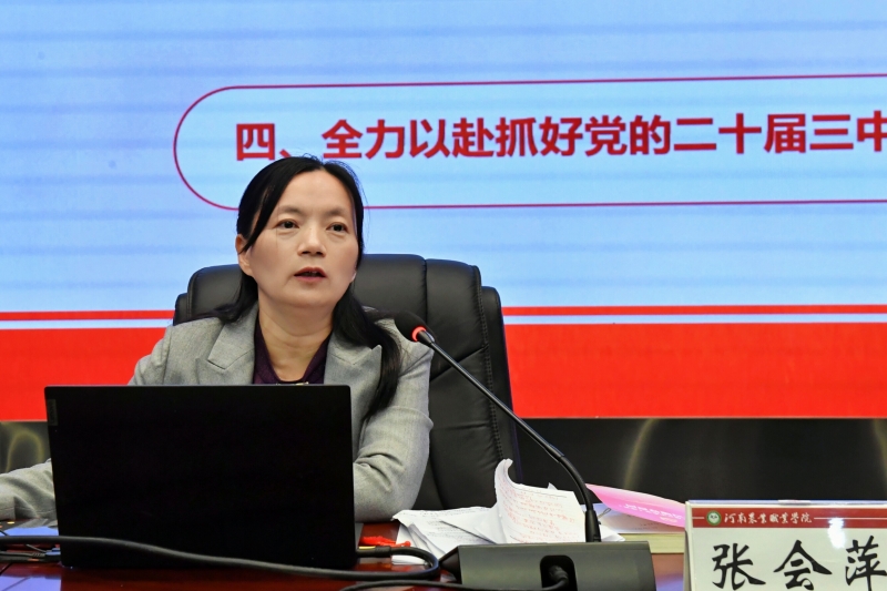 为全面深入学习领会党的二十届三中全会精神,使党的创新理论最新成果融入学院思想政治工作、贯穿教育教学全过程,扎实推进学习宣传贯彻工作,引导广大党员干部师生更好地用党的二十届三中全会精神武装头脑、指导实践、推动学习、工作,根据省委教育工委、省教育厅《学习贯彻党的二十届三中全会精神集中宣讲进高校工作方案》,11月20日,河南农业职业学院邀请学习贯彻党的二十届三中全会精神省委教育工委宣讲团成员、河南中医药大学马克思主义学院院长张会萍教授来做宣讲。在校领导班子成员、全体中层干部、全体辅导员和专兼职教师代表500余人参加宣讲会。宣讲会由党委宣传部部长满曙光主持。