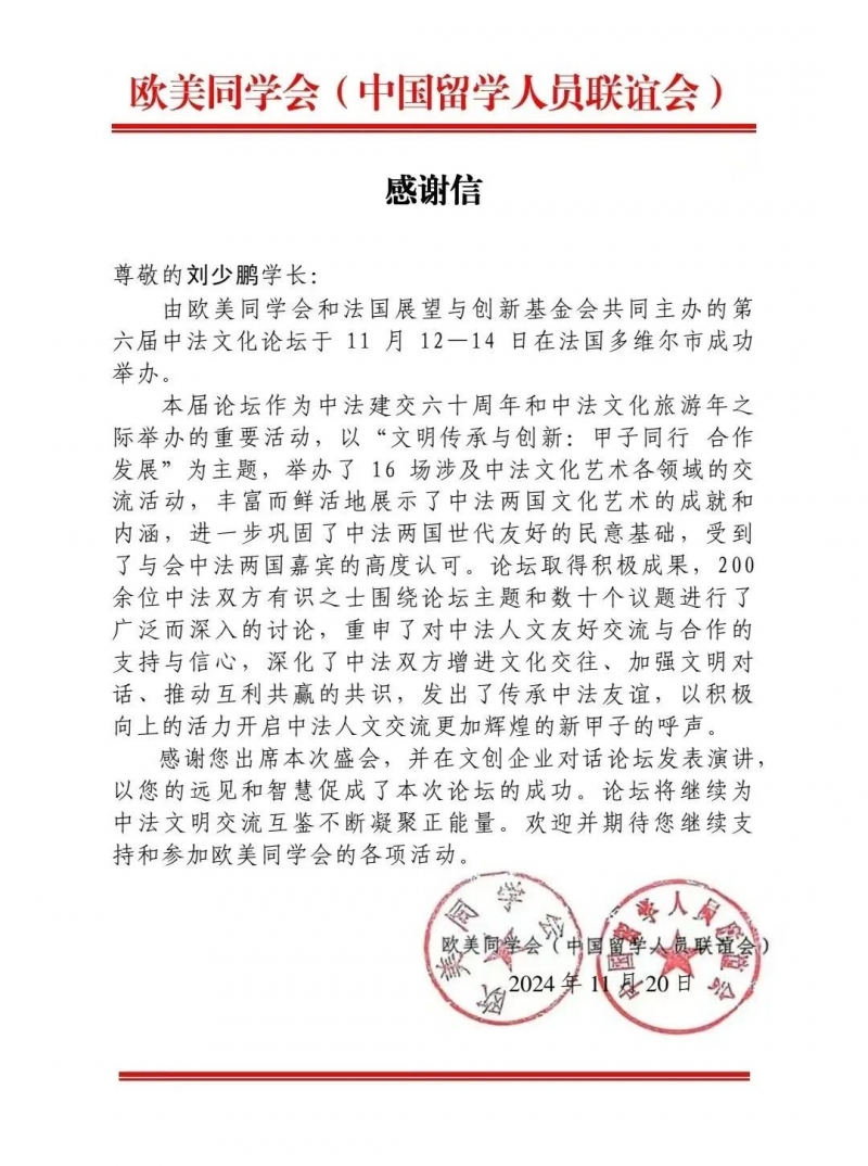 11月20日,在第六届中法文化论坛结束后,欧美同学会(中国留学人员联谊会)特向院长刘少鹏发来一封感谢信,感谢他在文创企业对话论坛发表的演讲,为深化中法双方文化交往、加强文明对话、推动互利共赢,传承中法友谊做出了积极贡献。