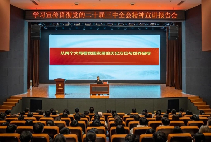 闻英教授围绕“党的二十届三中全会的重大时代意义和深远历史影响”“深入学习领会习近平总书记在党的二十届三中全会上的重要讲话精神”“全面准确理解《中共中央关于进一步全面深化改革、推进中国式现代化的决定》提出的进一步全面深化改革重大举措”“以实际行动贯彻落实党的二十届三中全会精神”四个方面,结合“两个大局”的历史背景,深入浅出地解读了党的二十届三中全会的丰富内涵和精神实质,全面系统地阐释了进一步全面深化改革的指导思想、总目标、重大原则、总体框架、重大举措。