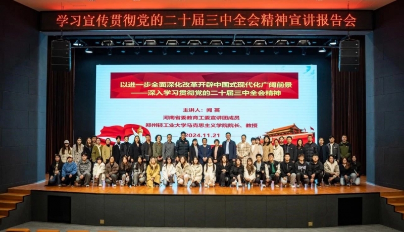 11月21日下午,学习贯彻党的二十届三中全会精神省委教育工委宣讲团成员、郑州轻工业大学马克思主义学院院长闻英教授走进郑州美术学院宣讲党的二十届三中全会精神。郑州美术学院党委书记王冰及在校领导、中层干部、师生党员等400余人参加宣讲会。宣讲会由郑州美术学院党委副书记、副校长李亚飞主持。