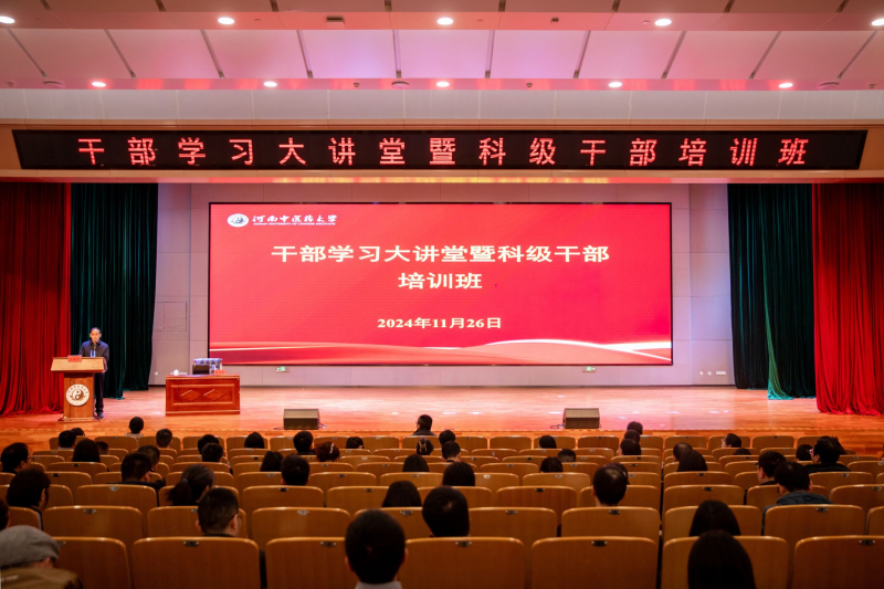 为深入学习贯彻党的二十届三中全会精神,提升新任科级干部的党性修养、政治素质和履职能力,2024年11月26日,河南中医药大学“干部学习大讲堂”暨科级干部培训班在俊学楼B101报告厅开班。校党委副书记、工会主席张加民出席会议并作动员讲话。特邀请学习贯彻党的二十届三中全会精神省委教育工委宣讲团成员——河南大学副校长、博士生导师张向东教授,以及河南中医药大学发展规划与学科建设处处长孙可兴教授作专题报告,全体科级干部参加培训。