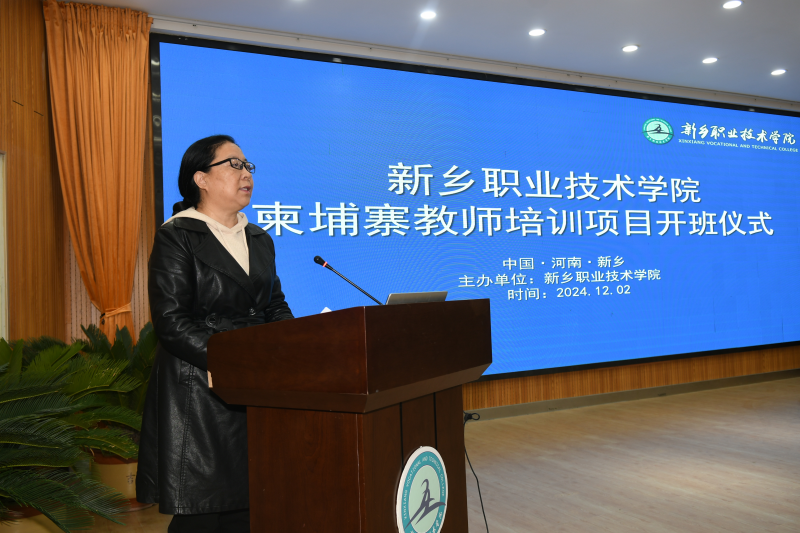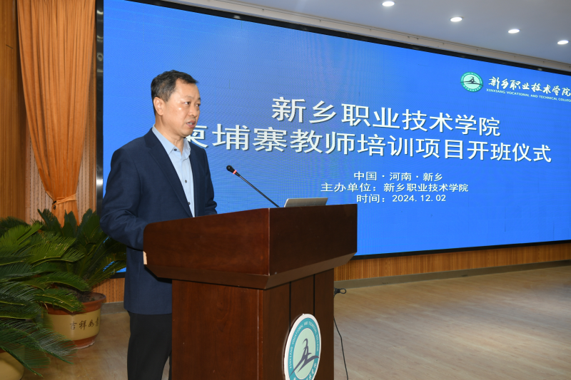 为积极推进共建“一带一路”高质量发展,深化中国-东盟中柬教育交流合作,新乡职业技术学院整合优势专业教学资源,与亚龙智能装备集团股份有限公司携手承办柬埔寨劳动与职业培训部技术和职业培训总局派送的13名教师专业技能培训项目。2024年12月2日,柬埔寨教师培训项目开班仪式在新乡职业技术学院主校区隆重举行。校党委书记张林、柬埔寨劳动与职业培训部技术和职业培训总局副局长Yim Pichmalika、亚龙智能装备集团股份有限公司董事长陈继权等出席开幕式并致辞。开班仪式由校长夏锦红主持。
