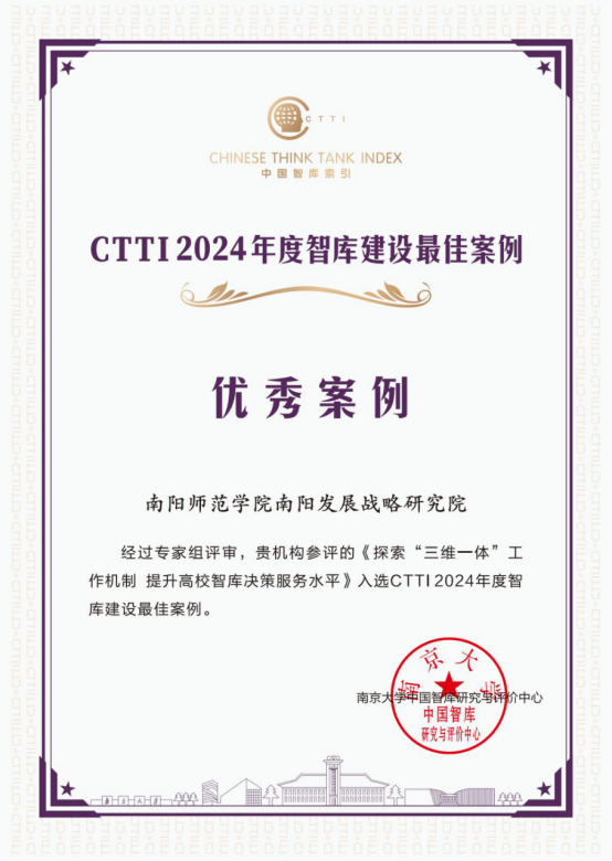 南京大学中国智库研究与评价中心发布的中国智库索引(CTTI)是国内目前反映智库影响力和知名度最权威的检索工具。2024年度CTTI 来源智库增补工作对智库的基础建设、课题与项目、决策咨询、理论创新和舆论引导、内部治理、个性特色等指标均做出了更高的要求。南阳发展战略研究院入选中国智库索引(CTTI)来源智库,标志着南阳师范学院智库建设工作得到了国内权威智库评价机构的认可。