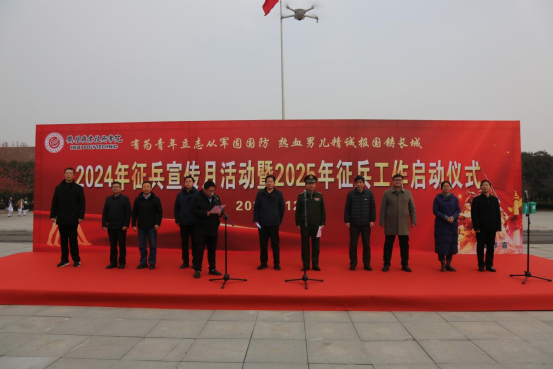 12月12日上午,鹤壁职业技术学院2024年征兵宣传月暨2025年征兵工作启动仪式在海棠园校区知行广场举行。学校党委副书记赵勇、鹤山区人武部政委解晓锋出席仪式,武装部负责人、各二级学院党总支负责人、征兵联系人、辅导员代表、大学生军事协会代表、学生代表260余人参加仪式。仪式由学校党委委员、工会主席杜永庆主持。