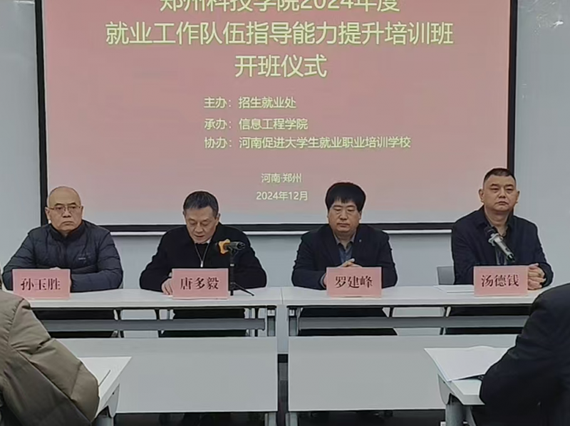 12月13日,郑州科技学院就业工作队伍指导能力提升培训班的开班仪式在招生就业处多功能报告厅举办。副校长唐多毅、教学工作部部长孙玉胜、招生就业处处长汤德钱以及主讲嘉宾、西北农林科技大学教授罗建峰出席,各二级学院书记、就业主任、就业专干、辅导员及招生就业处全体人员参加。开班仪式由汤德钱主持。