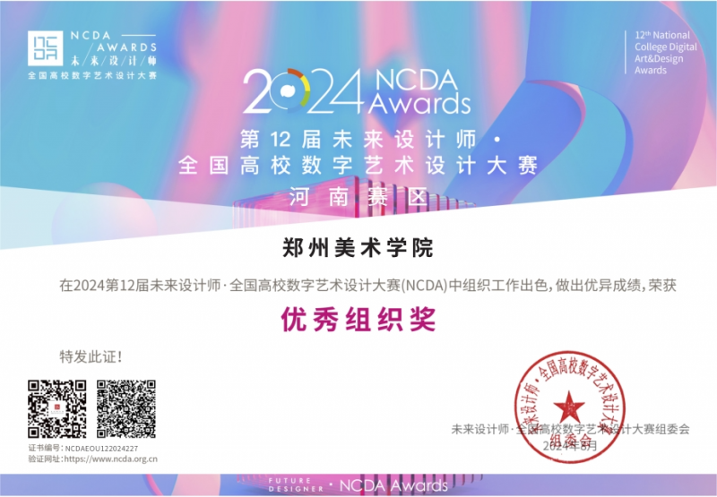 近日,2024第12届未来设计师·全国高校数字艺术设计大赛(NCDA)国赛获奖名单公布,郑州美术学院全国总决赛获奖6项作品,其中,一等奖2项,二等奖2项,三等奖2项;河南省赛获奖30项作品,其中,一等奖8项,二等奖9项,三等奖13项,并荣获优秀组织单位。