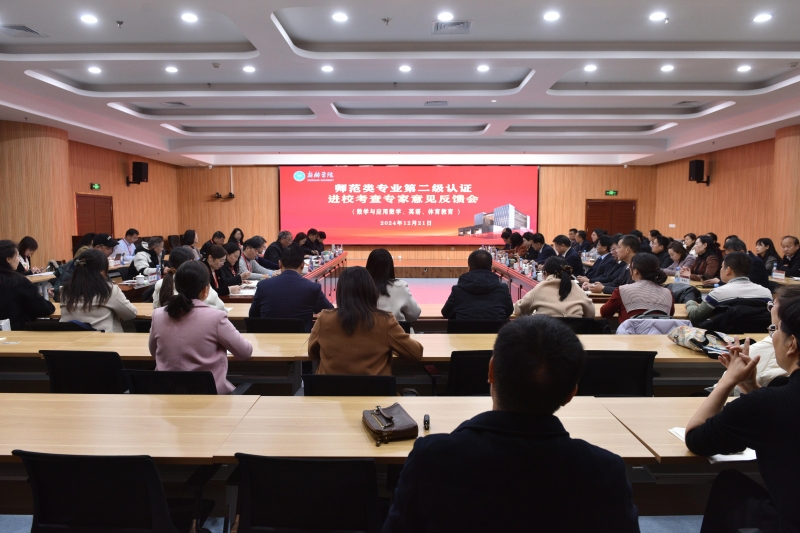 12月21日上午,新乡学院在图书馆东报告厅召开数学与应用数学、英语和体育教育专业师范认证专家意见反馈会。教育部师范类专业认证联合认证组组长、华东师范大学原副校长庄辉明,数学与应用数学专业认证专家组组长、安徽师范大学数学计算机科学学院原院长祝东进,英语专业认证专家组组长、沈阳大学外国语学院院长王焱,体育教育专业认证专家组组长、江西师范大学体育学院院长罗林及专家组成员,河南省教育评估中心副主任张新民,新乡学院党委书记孙功奇,校长王孝俊,党委副书记、工会主席高炜,党委副书记宋伟,副校长韩辉、杨钧、张银堂、陈磊山、赵伟杰出席反馈会。学校相关职能部门负责人、认证专业所在学院领导班子、专业团队成员、设置有师范类专业学院的院长、公共课开课学院院长参加会议。会议由庄辉明主持。