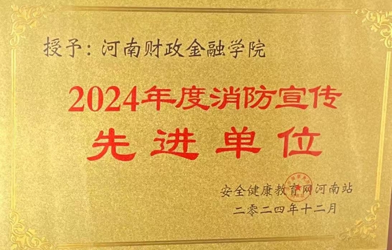 近日,中国安全健康教育网河南站对“2024年度消防宣传先进单位”进行了表彰,河南财政金融学院被授予“2024年度消防宣传先进单位”荣誉称号,保卫处副处长赵磊、消防科李建民被评为“河南省消防宣传先进个人”。