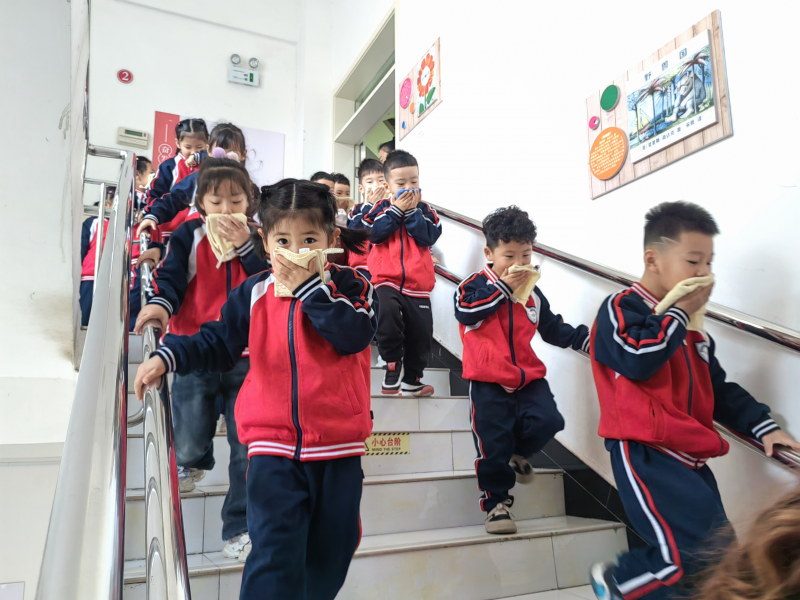 当紧急的消防警铃响彻全园时,所有教职工立即停下手中的工作。各楼道安全员迅速到位,老师们迅速带领孩子拿起湿毛巾捂住口鼻、弯腰低身,按紧急疏散路线,分楼层、分区域、有秩序地从班级撤离,疏散到安全地带。
