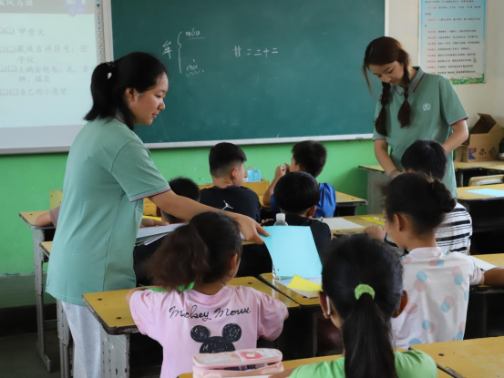 支教实践队员张雨馨、陈思睿为李西小学学生分发材料