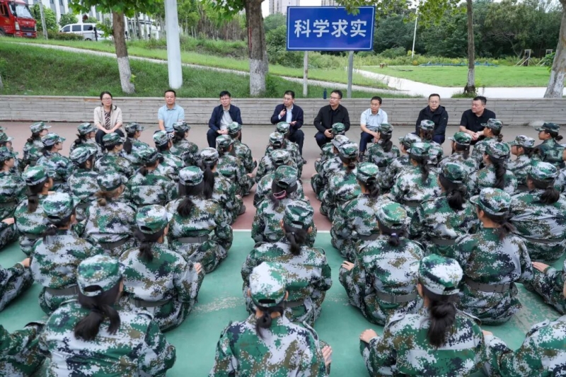 随后,张进超与席地而坐的2025级新生代表进行了深入交流。他亲切询问同学们在军训中的感受、生活上的困难以及对大学生活的适应情况,认真倾听同学们的心声,对大家在军训中展现出的坚韧与努力给予充分肯定,并鼓励同学们珍惜军训时光,磨砺意志,培养良好的生活和学习习惯,尽快融入大学生活,在学院这片沃土上实现自己的人生理想。