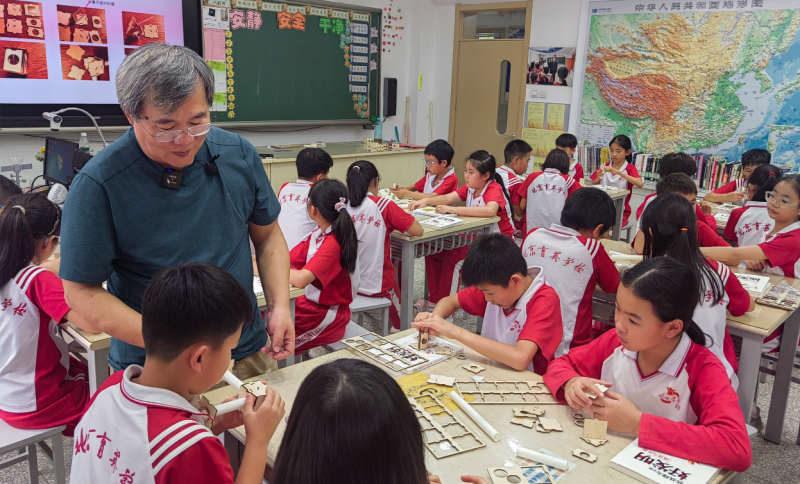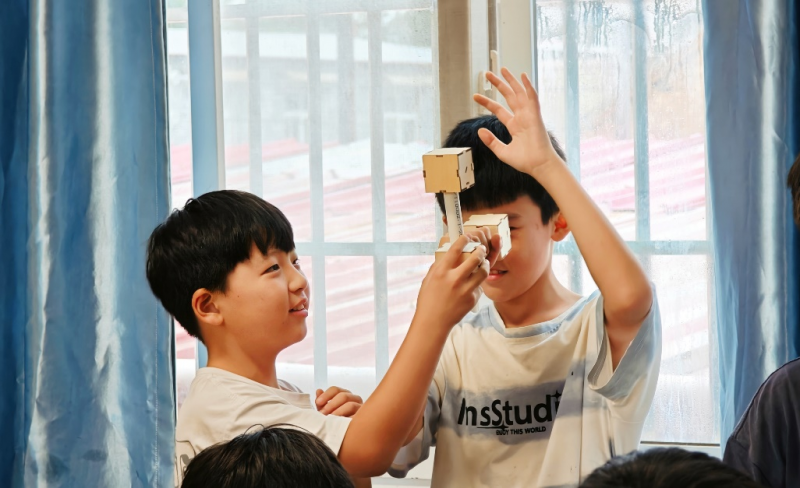 小学段课程以《制作一个窥镜》为内容,由高云峰教授与北京市育英学校教师邱贝贝共同指导。课程以《抗战烽火中的好发明——战法与武器》一书中“从地道照明到内窥镜”的发明思维大迁移切入,结合小学科学五年级上册《光》单元中光的反射原理,引导学生探索光学知识在实战中的运用。在实践环节,学生利用材料拼装窥镜,既受到抗战精神的感染,又锻炼了动手能力,启发了创新思维。