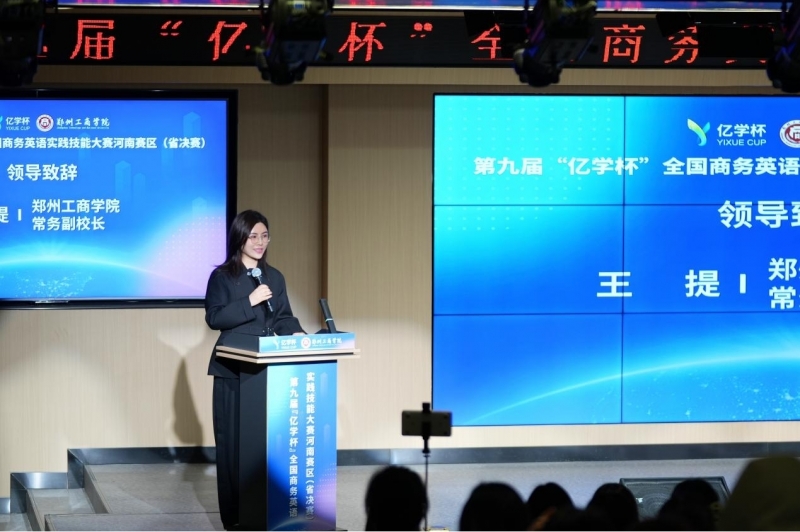 王提介绍了郑州工商学院的基本情况、办学定位、学科优势与育人成果,强调本届商务英语实践技能大赛秉持“以赛促教、以赛促学、以赛促改、以赛促建”的理念,深度契合商务英语专业“实践+应用”的核心特色,在推动专业教学改革、提升学生商务实操能力与跨文化沟通素养等方面意义深远。她表示本届大赛是全省高校商务英语学子交流互鉴的重要平台,将进一步点燃学生学习热情、锤炼实践本领,为培养兼具专业素养与实战能力的应用型商务英语人才注入强劲动力。