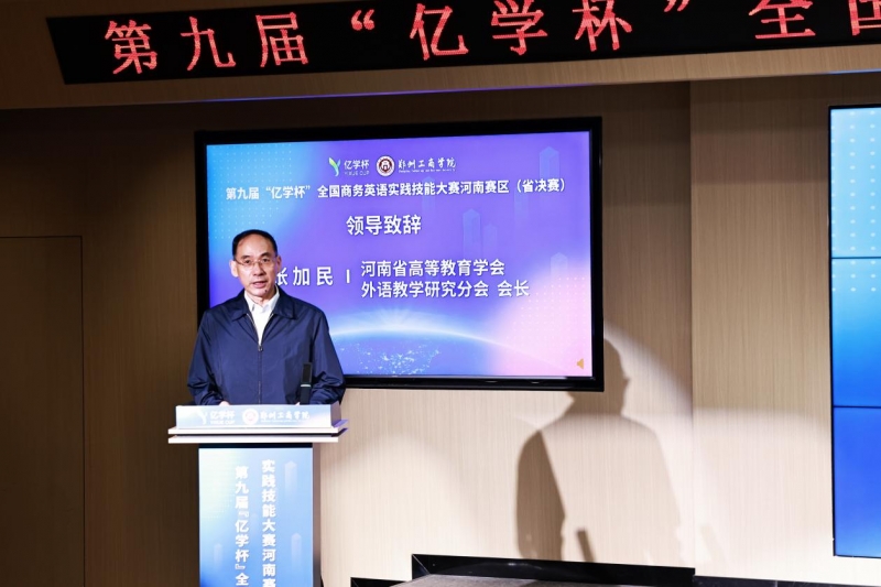 为强化商务英语专业人才实践能力培养,搭建高校专业交流与技能比拼平台,9月19日—21日,第九届“亿学杯”全国商务英语实践技能大赛河南赛区省决赛在郑州工商学院成功举办。本次大赛由河南省高等教育学会指导,河南省高等教育学会外语教学研究分会主办,郑州工商学院承办,福建亿学教育科技集团有限公司协办,来自全省20所高校27支参赛队伍的200余名师生参与本次竞赛。河南省高等教育学会副秘书长张宝柱、河南省高等教育学会外语教学研究分会会长张加民、福建亿学教育科技集团有限公司副总经理龚振锋受邀出席并致辞。郑州工商学院常务副校长王提致辞并宣布比赛开幕。