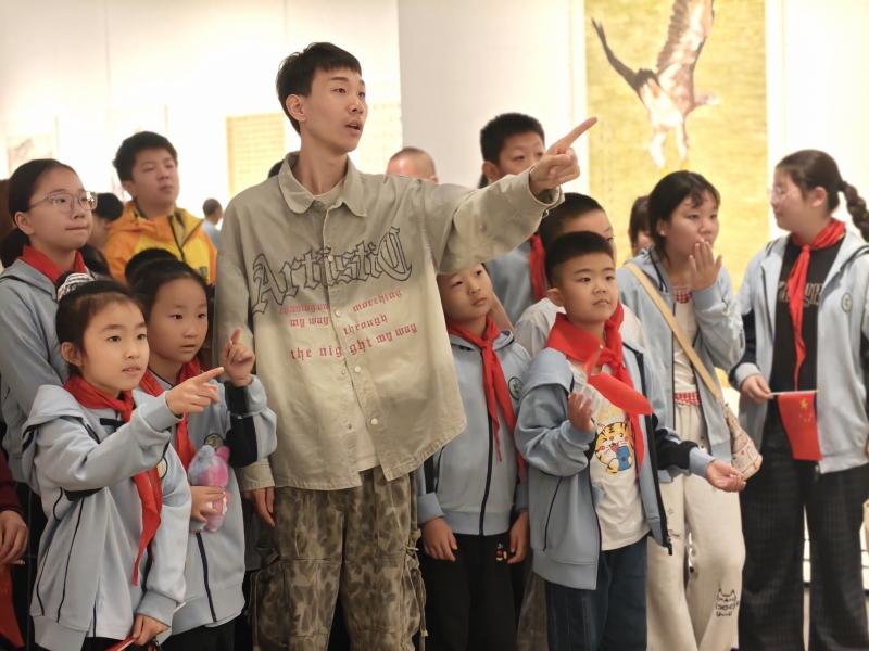学生们沉浸于艺术世界之中,或驻足细观,或低声交流,感受国画艺术所承载的文化底蕴与时代精神。通过这场美育实践,孩子们不仅提升了审美能力,也更加直观地认识到祖国的发展与强大,爱国情怀油然而生。