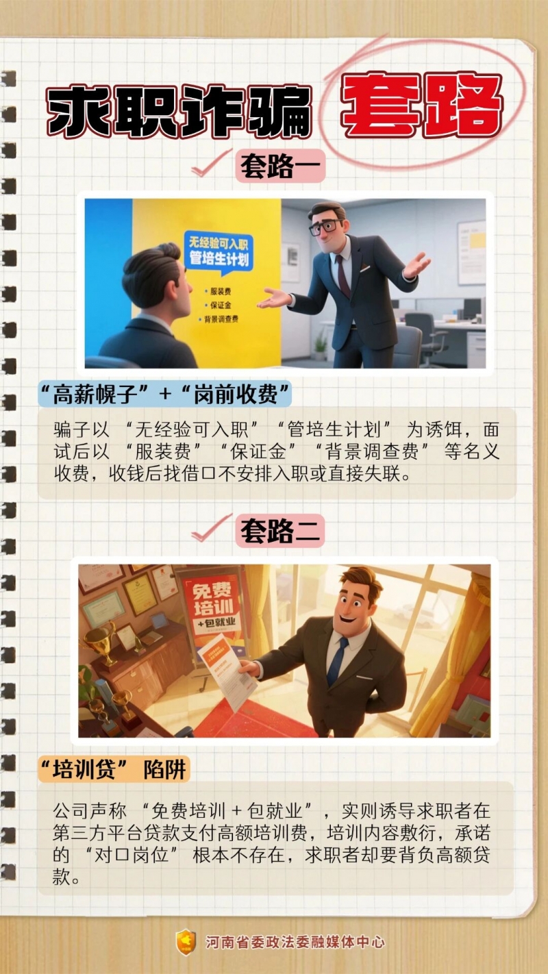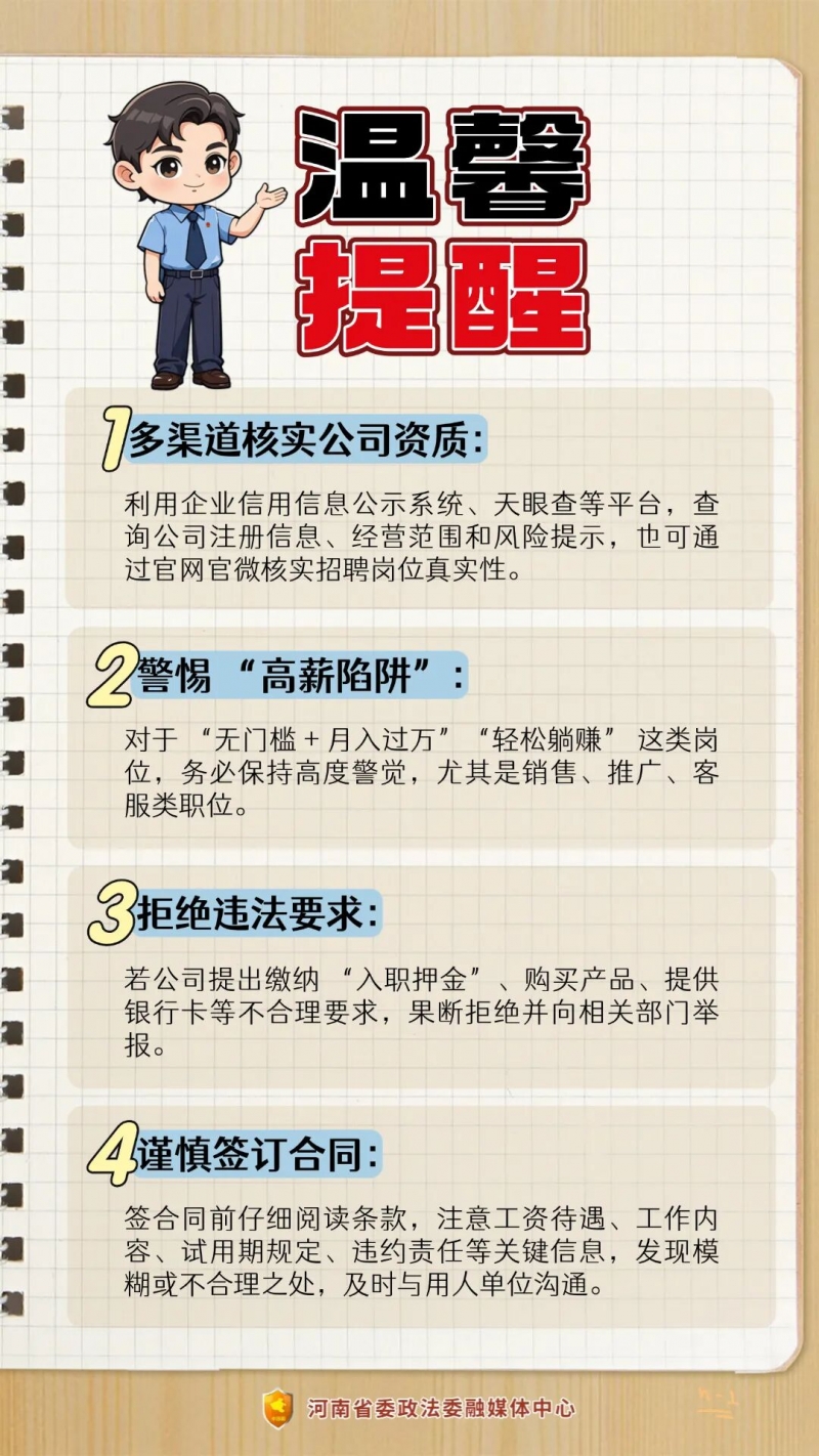 金九银十”求职季,求职者一定要擦亮双眼,那些看似高薪、轻松、低门槛的“机会”极有可能是求职诈骗“套路”,这份求职防骗指南带你远离诈骗陷阱!