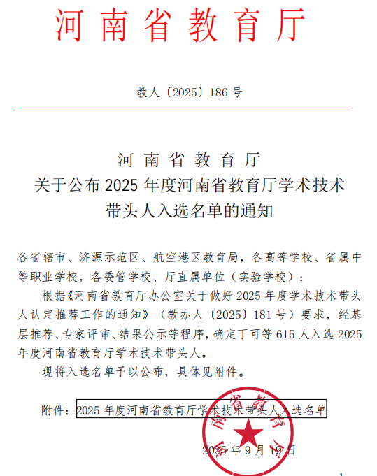 近日,河南省教育厅正式发布《河南省教育厅关于公布2025年度河南省教育厅学术技术带头人入选名单的通知》,经过严格评审与层层筛选,郑州理工职业学院史璐璐老师凭借其在学术研究与教学实践中的卓越表现和突出贡献,成功入选2025年度河南省教育厅学术技术带头人。