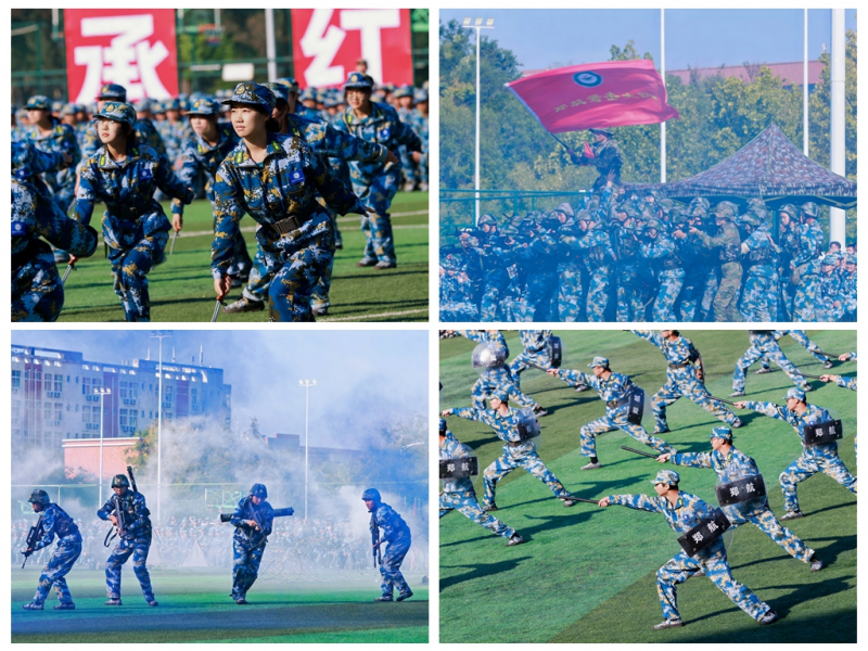 典礼在庄严的国歌声中拉开帷幕,军训成果汇报展演正式开始。各连队方阵迈着铿锵有力的步伐依次走过主席台,接受检阅。同学们身着戎装,以气宇轩昂的英姿,自信展现着军事训练带来的蜕变与成长。紧接着是军事科目汇报表演,盾牌术方阵率先登场,劈砸格挡间气势如虹;匕首操方队动作整齐利落,展现出巾帼不让须眉的气概;军体拳、刺杀操刚劲有力,喊声震彻全场。战术演练压轴上演,队员们在模拟的硝烟中穿插跃进,身手敏捷,配合默契,引爆全场。