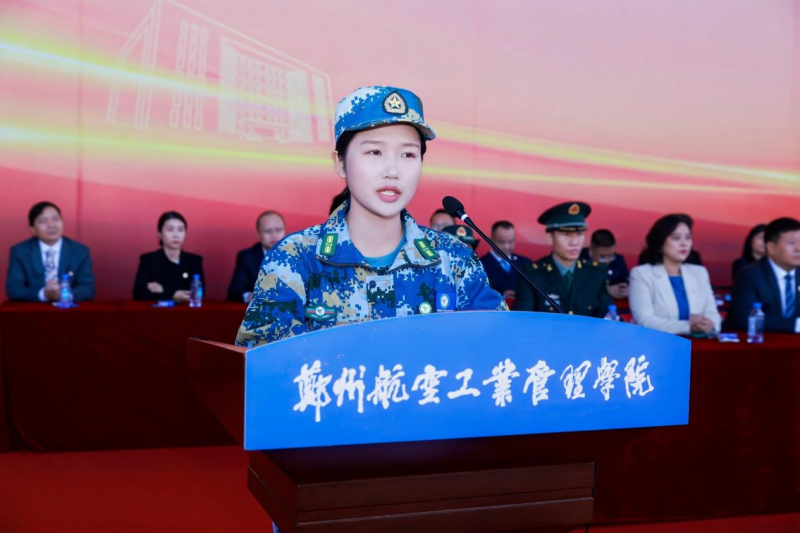 信息管理学院本科生边心语代表高年级学生发言,今年光荣参加九三阅兵的她分享了参阅期间刻苦训练、拼搏奋斗的珍贵经历,她号召同学们要敢想敢拼、敢闯敢试,在郑航找准人生目标,锤炼坚韧意志与勇往直前的魄力,在郑航书写无悔的青春篇章。边心语的发言真挚而充满力量,生动诠释了郑航学子将个人成长与国家命运紧密相连的担当精神。