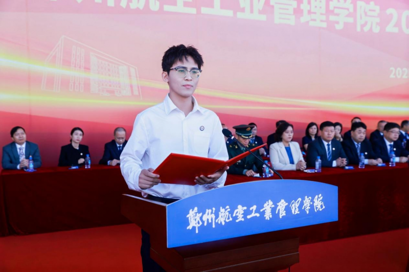 商学院2025级本科生朱雨欣、电子信息学院2025级研究生姜华雨作为新生代表发言,“作为新时代青年,站在郑航的跑道上,我立志在未来大学生活中努力成为会‘解码’的学习者、有‘温度’的行动者、敢‘逐梦’的追光者,带着空天报国的赤子之心,成为担当民族复兴大任的‘空天后浪’。”朱雨欣在发言中许下青春誓言。公派留学归来的姜华雨重返郑航,在新一代电子信息技术专业深造,继续践行科研报国的初心,他庄严承诺,将传承“空天报国”的精神基因,将个人理想融入党和国家的事业之中,让青春焕发绚丽的光彩。