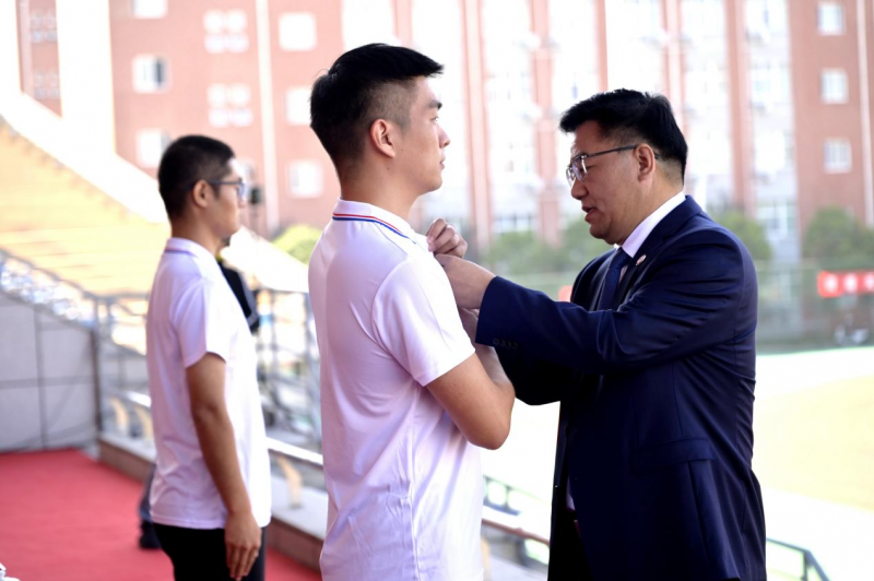 校党委书记王全良为新生代表佩戴校徽,全体新生一同郑重地将校徽佩戴于胸前。这一刻标志着一段崭新人生旅程的正式开启,所有新同学从此刻起,拥有了一个共同的名字——郑航人。