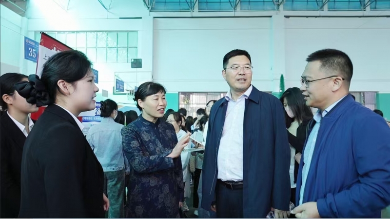 在双选会现场,时斌与用人单位、毕业生进行深入交流,详细询问用人单位招聘需求、薪资待遇等,倾听毕业生求职诉求,鼓励他们合理定位、主动沟通,把握就业机会。同时希望企业与学校深化合作,围绕人才培养、实习实训等领域搭建发展平台,促进供需双方更加精准有效对接。