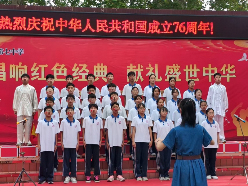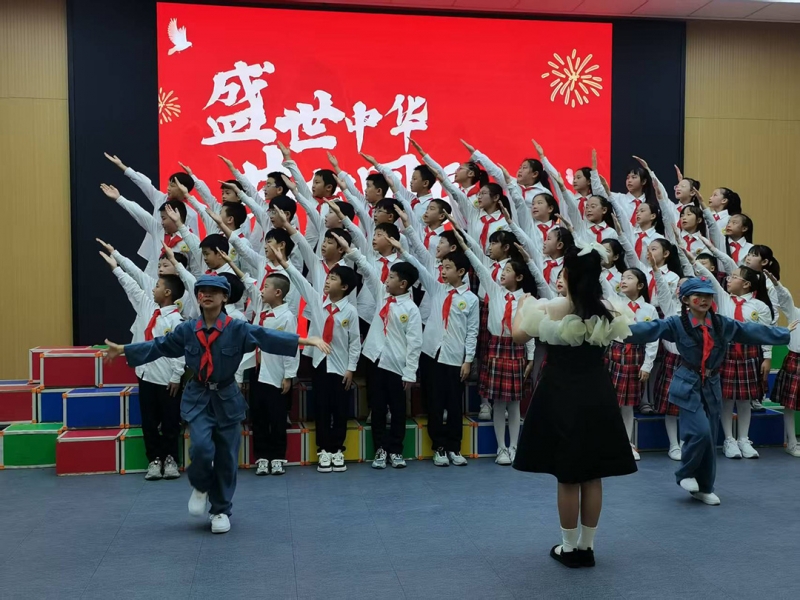 “我和我的祖国,一刻也不能分割……”马村工小报告厅中三年级二班的同学们正在参加“红歌嘹亮 祝福祖国”校园红歌节,激情歌唱,表达着对祖国的祝福。舞台上,学生们身着传统服饰或军装,以合唱、朗诵、舞蹈等形式创新演绎经典曲目。《歌唱祖国》的旋律中,数十名学生挥舞国旗组成“76”字样;《在希望的田野上》融入了非遗腰鼓表演,赢得阵阵掌声。