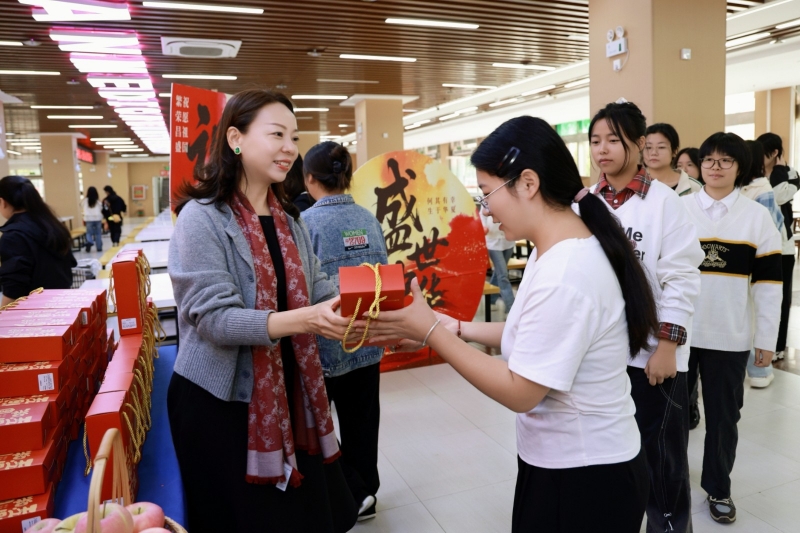 在平原校区,校长李琼、副校长马波来到学生食堂,为留校的同学们一一送上节日的祝福。食堂内窗明几净,在学校的精心布置下,悬挂着祝福标语,洋溢着浓厚的节日气氛。李琼将寓意团圆的月饼和象征平安的苹果递到同学们手中,关切地了解他们的假期安排和实际需求。她勉励同学们要合理安排时间,既要放松身心,也要坚持学习,让这个假期充实而有意义。现场气氛温馨融洽,欢声笑语不断,充满了节日的喜悦。