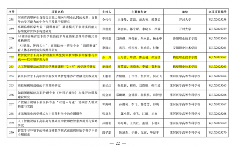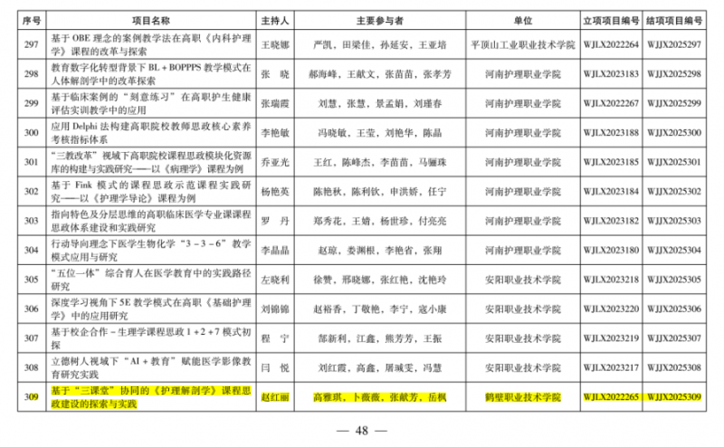 根据《河南省卫生健康委员会关于公布2025年河南省医学教育研究项目立项和结项名单的通知》(豫卫科教函〔2025〕21号),鹤壁职业技术学院申报的3个医学教育研究项目顺利通过结项验收,同时成功立项2025年河南省医学教育研究项目2个,立项数量在省内同类职业院校中位于前列。