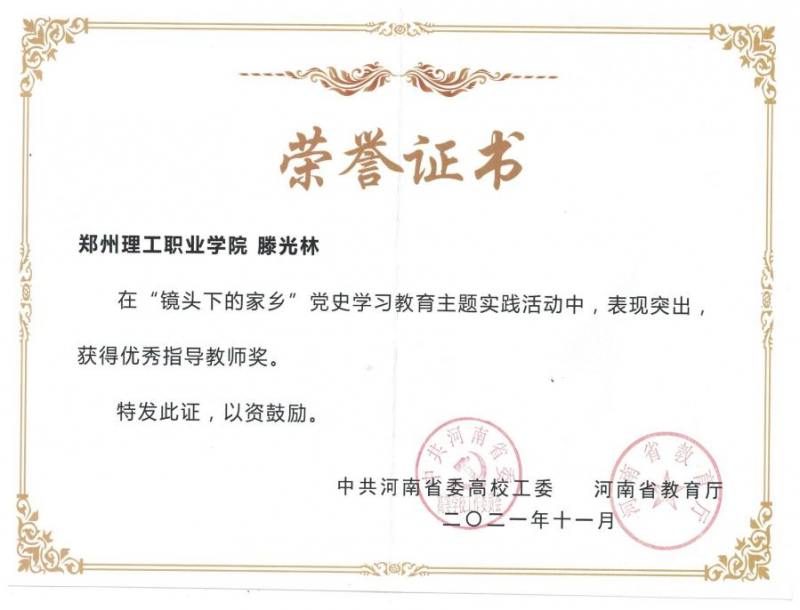 滕光林长期担任微电影学会指导老师,为学生搭建专业实践与思想引领的平台,因指导成果显著,于2022年被河南省委高校工委、省教育厅评为“河南省优秀指导教师”。同时,滕光林深刻认识到网络意识形态工作的重要性,他不仅是现实工作中的宣传骨干,也是网络空间的文明使者。他积极学习运用新媒体技术,拓展网络宣传渠道,主动发声,弘扬主旋律。他自觉规范网络行为,积极传播健康、向上、文明的网络文化,勇于驳斥错误言论,在网络空间中展现了高校教师的良好素养。因其在网络空间的积极作为和正面影响,他被河南省委高校工委、省教育厅再度评为“河南省文明网民”,这一荣誉体现了他在线上线下共同践行着思政育人的责任与担当。