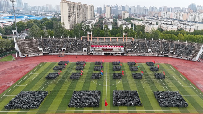 10月11日上午,安阳师范学院2025级新生军训成果汇报暨总结表彰大会在弦歌大道校区北体育场和文明大道校区同时举行。校党委副书记王宏伟,副校长时斌,校军训工作领导小组成员单位负责人,各学院党委副书记、辅导员,全体教官和参训新生观看军训成果汇报。