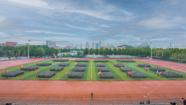 军训成果汇报科目分为分列式、捕俘拳、刺杀操、匕首操、擒敌拳及战术基础等6个科目。旌旗猎猎,口号嘹亮。各院新生以蓬勃的朝气、如火的热情展示了此次军训成果。分列式方阵依次走正步通过主席台,大家个个精神抖擞、目光坚定,尽显青春风采与纪律严明;捕俘拳表演刚劲有力,出拳迅猛、踢腿凌厉,一招一式都在展现着新生们不畏艰难的拼搏精神;刺杀操方阵气势如虹,学生们手持模拟步枪,刺杀动作精准果断,尽显热血豪情;匕首操表演灵动利落,劈、刺、削等动作连贯流畅,将力量与技巧完美融合;擒敌拳方阵整齐划一,拳风呼啸,每一个动作都刚柔并济,打出了新生们的精气神;战术基础展示紧张逼真,新生们快速卧倒、匍匐前进、战术隐蔽,一系列动作娴熟规范,使观众身临其境。