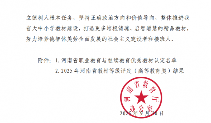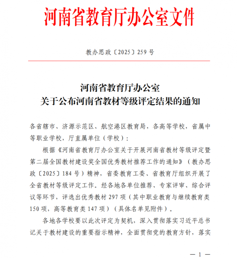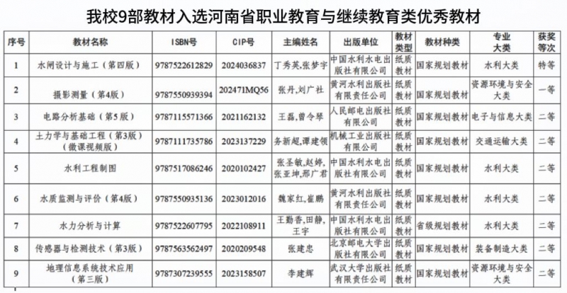 根据《河南省教育厅办公室关于开展河南省教材等级评定暨第二届全国教材建设奖全国优秀教材推荐工作的通知》(教办思政〔2025〕184号)精神,省委教育工委、省教育厅组织开展了全省教材等级评定工作,评选出职业教育与继续教育类优秀教材150项,学校丁秀英,张梦宇教授主编的《水闸设计与施工(第四版)》等9部教材入选并获奖,其中特等奖1部,一等奖1部,二等奖7部。
