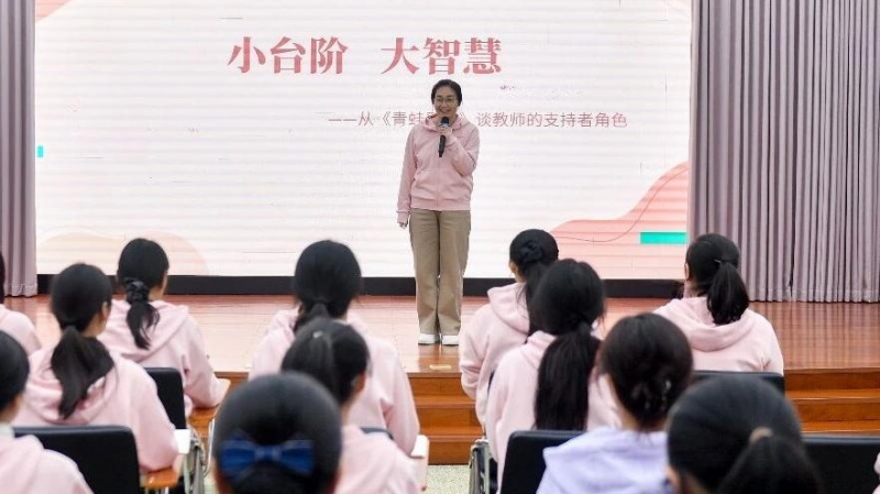 活动伊始,外出参加省级名师培训的王鸣鸣老师进行了返岗实践交流。王鸣鸣以寓言故事《青蛙看海》为镜,生动映照出教师作为“成长支持者”的深刻内涵。