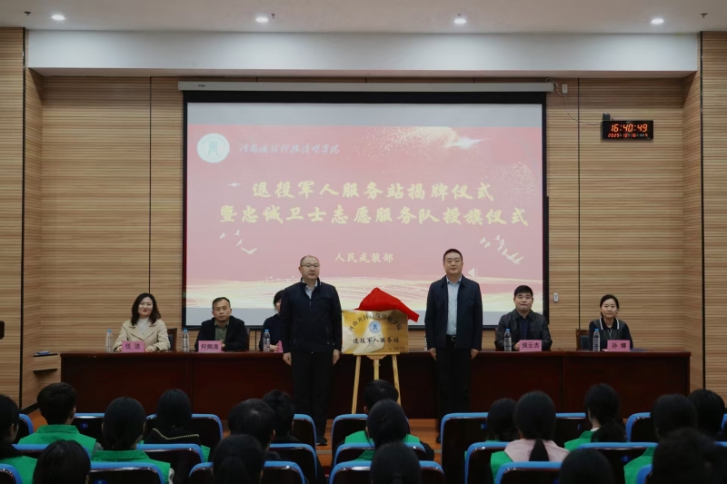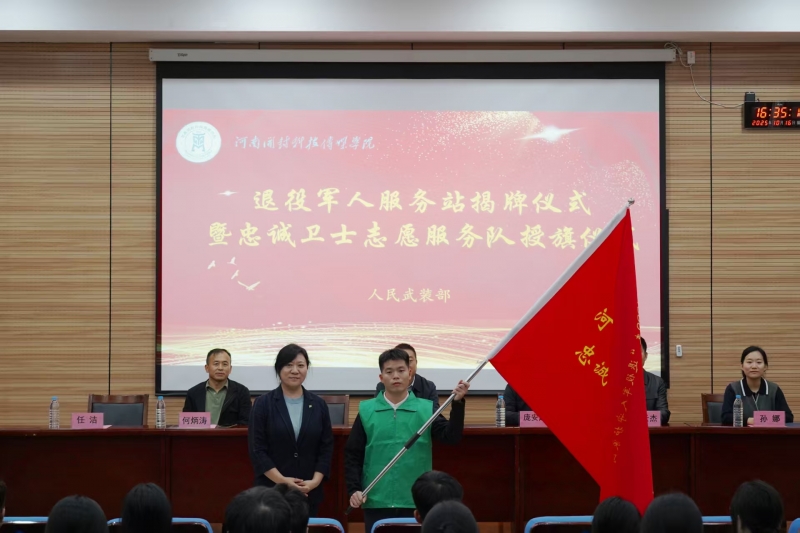 10月16日下午,河南开封科技传媒学院(以下简称“科传学院”)举行退役军人服务站揭牌仪式暨科传学院忠诚卫士志愿服务队授旗仪式。开封市退役军人服务中心主任鲁腾飞、城乡一体化示范区退役军人事务局局长吴琰、科传学院校党委副书记庞安超、校人民武装部负责同志参加会议。