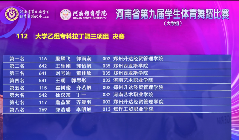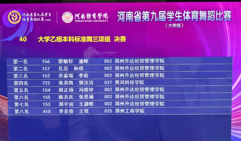 10月17-18日,由河南省教育厅、河南省体育局主办的河南省第九届学生体育舞蹈比赛在河南体育学院隆重举行。来自全省的43支代表队,900余名运动员参加本次大赛。郑州升达经贸管理学院体育舞蹈代表队取得了10项第一名,19项第二名,14项第三名的佳绩,并获得本次比赛的体育道德风尚奖。