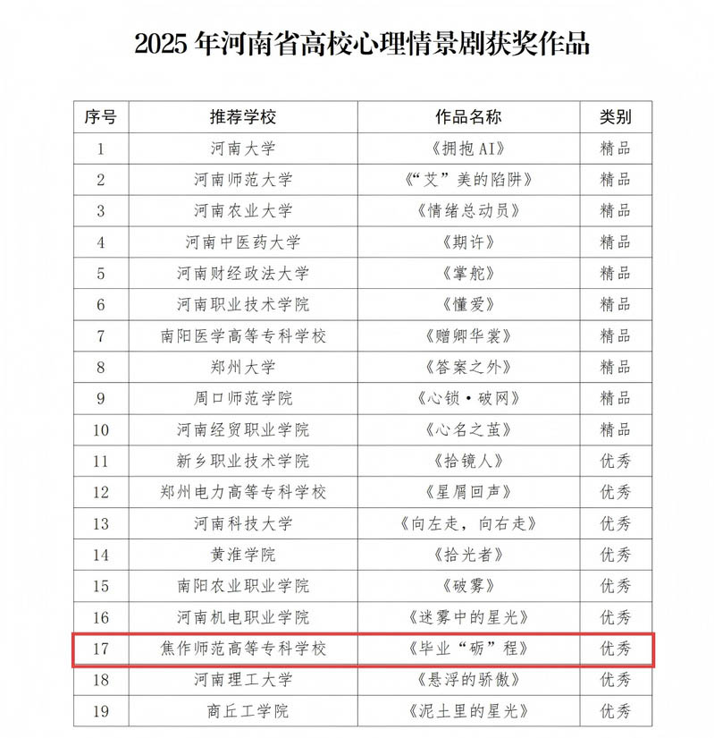 为深入贯彻落实习近平总书记关于心理健康工作的重要指示精神,落实教育部等十七部门《全面加强和改进新时代学生心理健康工作专项行动计划(2023—2025年)》,省委教育工委、省教育厅在全省高校开展了心理情景剧作品征集活动。焦作师范高等专科学校原创作品《毕业“砺”程》获评河南省高校心理情景剧“优秀”作品。