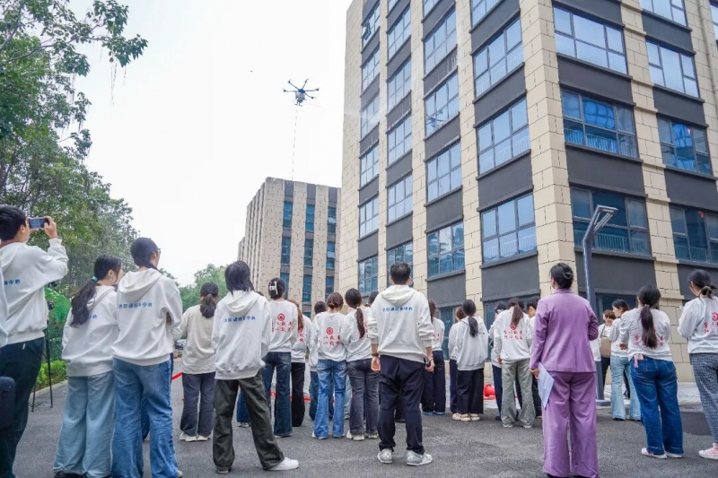 在恒生科技园,同学们现场观看了中曌遥感科技有限公司智能清洗无人机高空作业。伴随着阵阵风浪,无人机腾空而起,喷出一道道泡沫水柱清洗着大楼外墙的玻璃。同学们不仅被先进科技赋能服务行业的场景所震撼,也被中曌遥感团队用代码编写“空中交通规则”,为物流、测绘、应急救援插上翅膀的故事所激励。