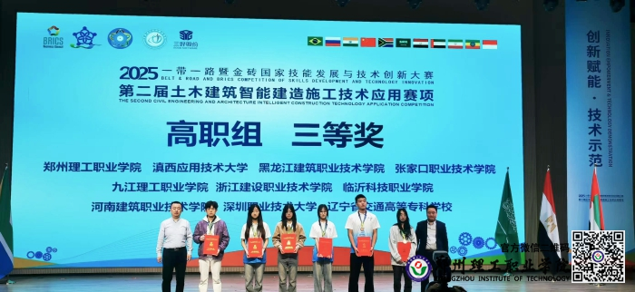 10月19日,2025“一带一路”暨金砖国家技能发展与技术创新大赛第二届土木建筑智能建造施工技术应用赛项(高职组)决赛在重庆圆满落幕。郑州理工职业学院参赛团队凭借扎实的专业技能与稳定的临场发挥,一举斩获三等奖,实现了学校在该项国际性赛事中从“首次参赛”到“成功夺牌”的历史性跨越,为该校技能竞赛成果再添标志性荣誉。