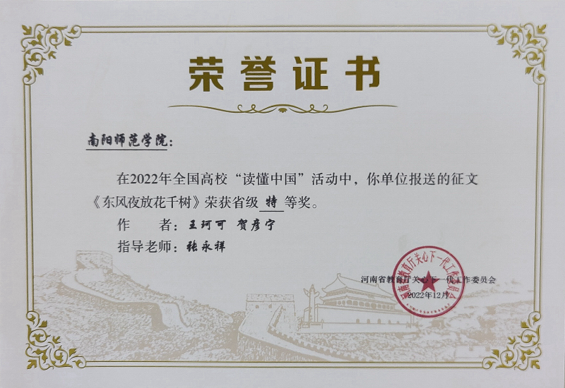 深化“读懂中国”活动,继往开来续新篇。学校关工委落实教育部“读懂中国”活动要求,精心组织、广泛宣传、深入挖掘,遴选“五老”典型与学生访谈,收评推荐优秀征文及短视频。2021—2023年推荐到省教育厅关工委的作品全部获奖,其中征文获特等奖3项、一等奖8项、二等奖3项、三等奖1项,微视频获特等奖5项、一等奖3项、二等奖1项;2022—2023年连续获得“优秀组织奖”;获评2023年教育部“读懂中国”活动表扬单位。
