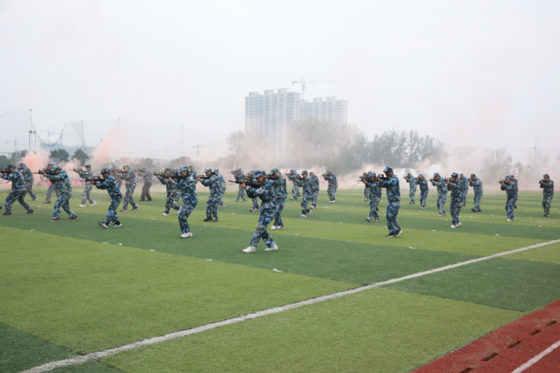 在庄严激昂的国歌声中,2025级新生军训汇报表演正式拉开帷幕。各新生连精神饱满、军容严整、士气高昂,踏着强有力的步伐、响亮的口号依次通过主席台接受检阅。战术表演环节,同学们在教官的指导下,模拟实战场景,迅速制伏目标、救护伤员,展现了精湛的协同作战素养与救死扶伤的医者使命。