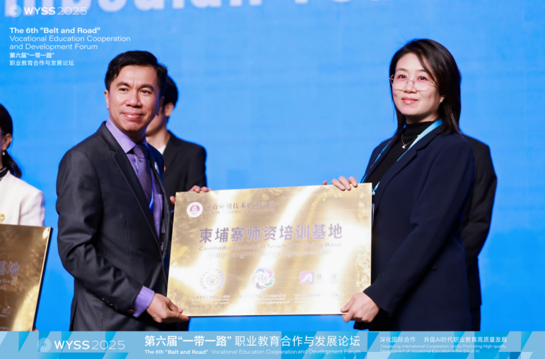 论坛举办期间,一系列重磅成果发布、落地。滕文锐代表学校接受“柬埔寨师资培训基地”授牌。授牌仪式上,柬方对于我校长期以来在柬方师资培训上的辛勤付出和突出成绩表示认可与感谢。滕文锐表示,学校作为全国三家接受授牌单位之一,将持续锚定职业教育国际化发展目标,抓住数字化发展机遇,深化双方合作,不断为柬埔寨职业教育师资队伍建设注入新动能,推动两国职业教育合作向更深层次、更广领域迈进。