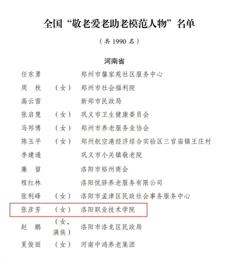 近日,民政部全国老龄工作委员会办公室公布了全国“敬老文明号”、全国“敬老爱老助老模范人物”名单,洛阳职业技术学院护理与康养学院院长张彦芳荣获全国“敬老爱老助老模范人物”称号。