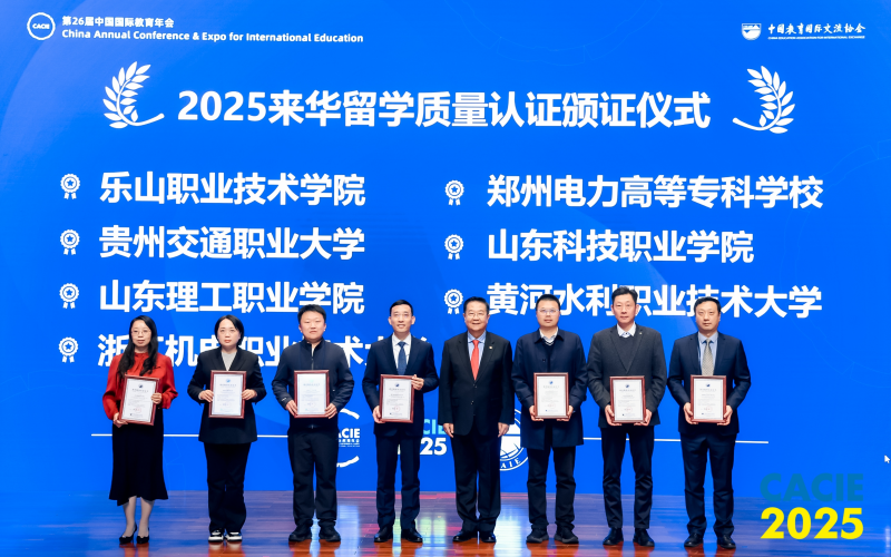 会议期间,2025来华留学质量认证颁证仪式同期举行。中国教育国际交流协会会长刘利民为郑州电专颁发来华留学质量认证证书。这一权威认证既是对学校来华留学生培养体系、教学质量与管理服务的高度认可,也标志着学校在国际化人才培养领域实现“走出去”与“引进来”双向赋能的里程碑式突破。学校将以此为契机,持续深化“中文+职业技能”教育内涵,通过“中文工坊”“大河工坊”和“电力丝路学院”等项目建设,为“一带一路”沿线国家能源电力发展贡献更多中国职教力量。