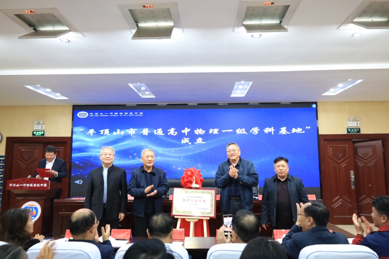 随后,河南省基础教育课程与教学发展中心原副主任丁武营、平顶山市教育和体育发展中心刘英明及司德平、关朝辉共同为“平顶山市高中物理一级学科基地”揭牌。
