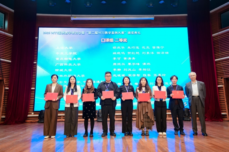 大赛旨在丰富MTI教学的多样性,汇聚不同高校的翻译硕士专业在MTI教学过程中积累的经验做法,同时为各类学校的MTI课程提供具有实践指导意义的教学案例。外国语学院依托河南省知识产权外译研究中心,聚焦知识产权外译研究与实践,深挖地理标志外译素材和案例,由教师姚晓鸣、贺红艳,MTI研究生刘豪洋、田泽瑞组成的团队以“AI+口译模拟项目:河南省地标产品国际推介会”为题的参赛案例荣获全国口译组二等奖;教师关成勇与MTI研究生白雨晨、李巧丽、杨晨斌团队以“探索‘四大怀药’译后编辑 讲好中国地标故事”为题的参赛案例荣获全国笔译组三等奖。在2025 MTI案例教学研讨会暨“第二届 MTI教学案例大赛”颁奖典礼平行论坛上,贺红艳代表团队的主旨发言获得与会专家的一致好评。