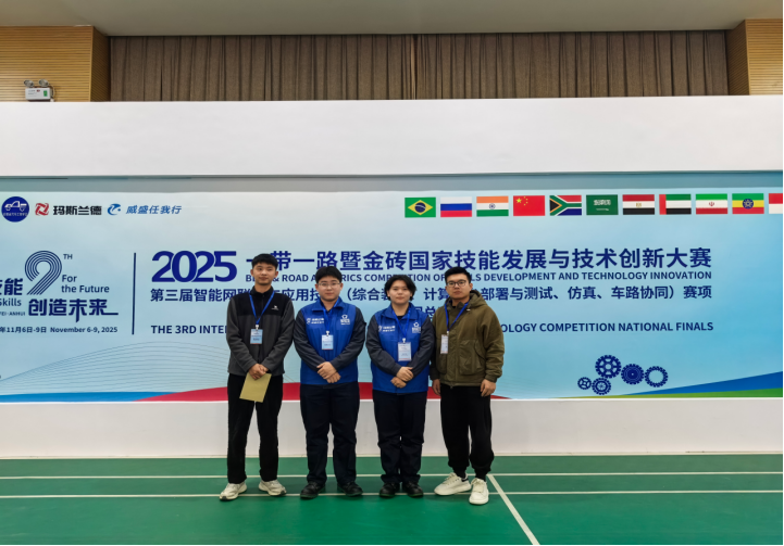 本次大赛由金砖国家工商理事会中方理事会、“一带一路”暨金砖国家技能发展国际联盟等单位联合主办,是全国职业院校汽车专业领域公认的职业技能顶级赛事。赛事通过“综合装调、计算平台部署与测试、模拟仿真、车路协同”四个环节,全面考察参赛选手在智能网联汽车技术应用领域的综合实操能力、创新思维和团队协作水平。备赛阶段,张立彪、张志超两位老师悉心指导,秦梦简、闵雪两名同学刻苦钻研,辛勤训练,掌握了娴熟的技术要领。赛场上,他们沉着冷静应对复杂场景挑战,精准完成各项操作任务,展现出了过硬的专业素养和良好的团队协作能力,喜获此项大奖。