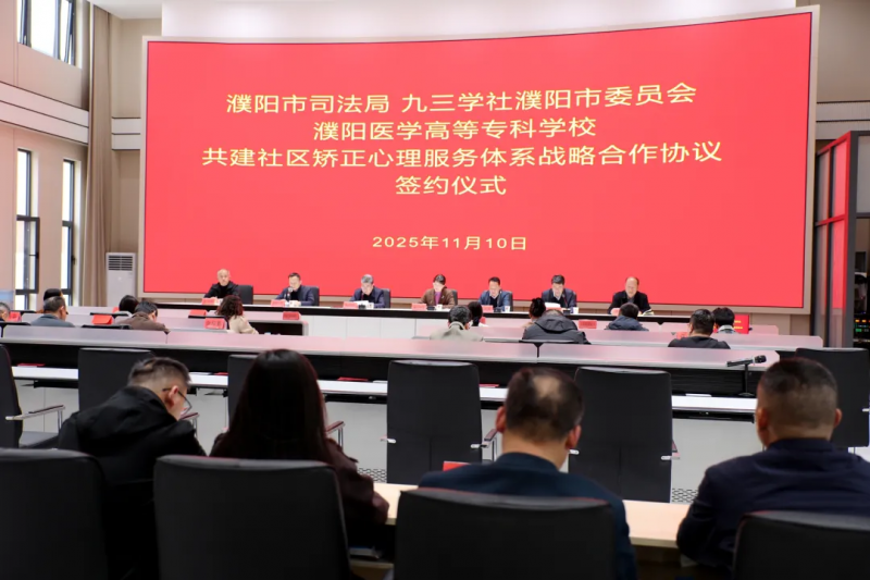 2025年11月10日,濮阳市司法局、九三学社濮阳市委员会、濮阳医学高等专科学校三方战略合作签约仪式在华龙区司法局成功举行,标志着我市社区矫正心理服务体系共建工作正式启动。此次跨部门、跨领域的强强联合,旨在为社区矫正对象构建一道坚实的“心理防线”,助力其重塑健康心态、顺利回归社会,是濮阳医专深化校地合作、履行社会责任的重要实践。
