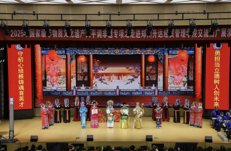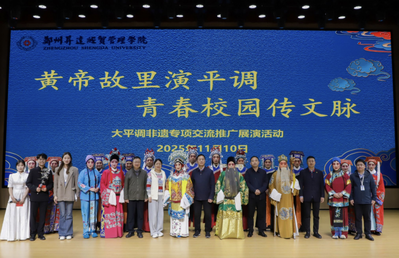黄帝故里演平调,青春校园传文脉。11月10日,国家级非物质文化遗产滑县大平调剧团交流推广活动在郑州升达经贸管理学院新图书馆三号报告厅举行。河南省艺术档案中心主任裴小松,滑县文化广电体育旅游局党组成员、副局长张秀飞,滑县大平调剧团团长黄高飞、党支部书记邢宝军;学校党委副书记、副校长、工会主席张金安以及董事会办公室主任杨存博、财务处处长张延霞、学科建设办公室主任李晓锋、校团委书记李霄锋等参加活动,与全校500余名师生一同沉浸于戏曲盛典之中。